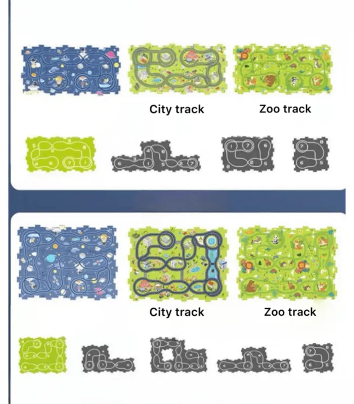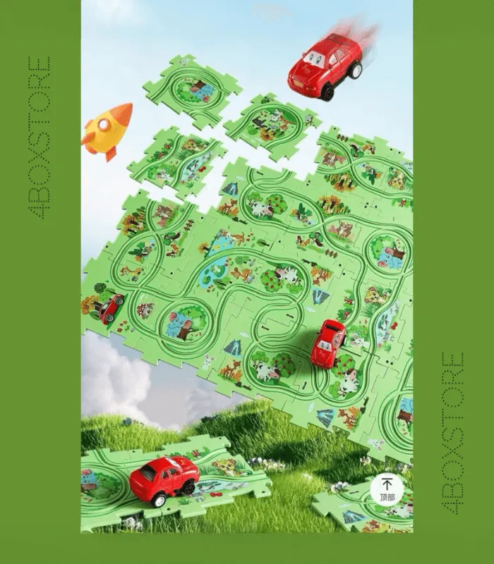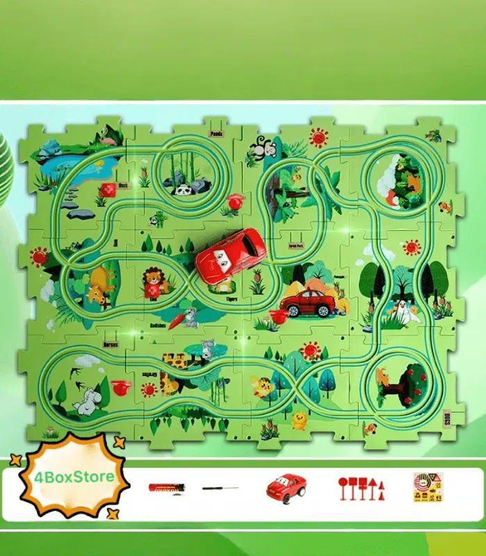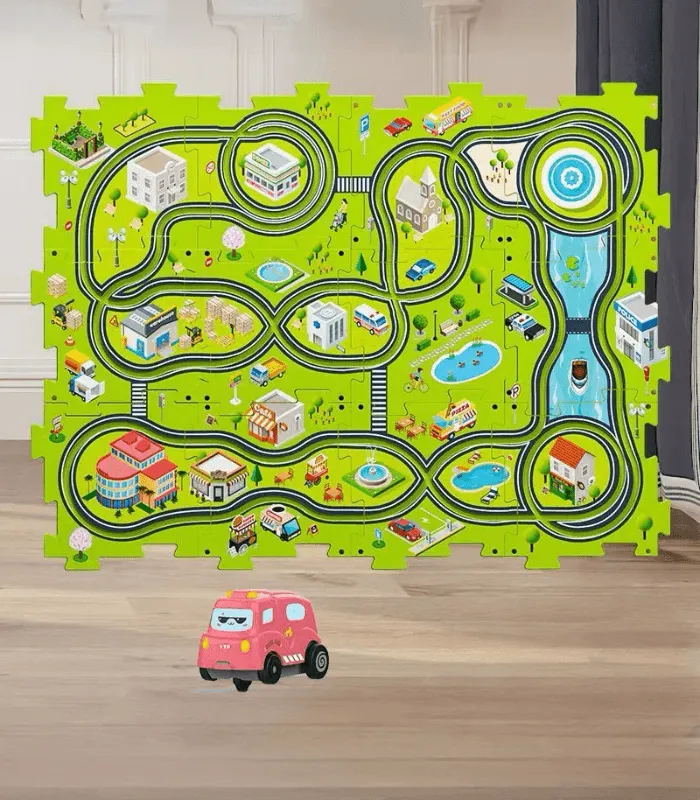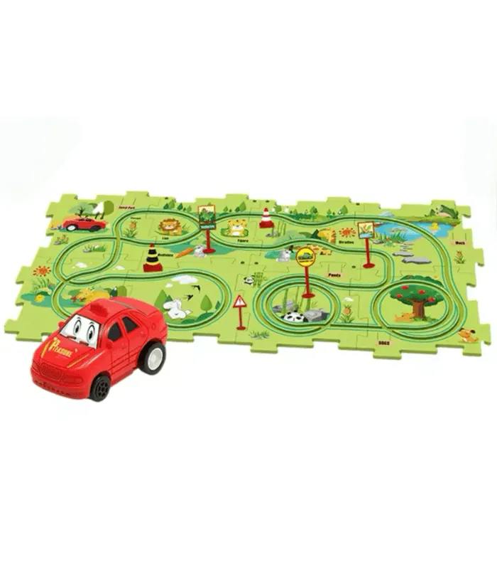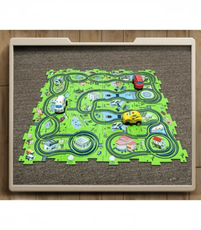 اللعبة دي بتجمع بين البازل و السيارات الكهربائية، وبتخلي الطفل يبني مضمار خاص بيه بقطع بازل سهلة الفك والتركيب (14×14 سم).